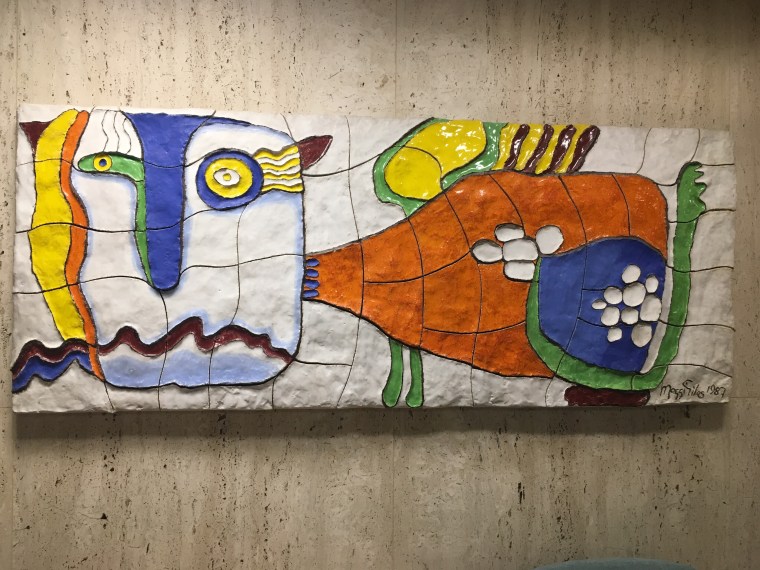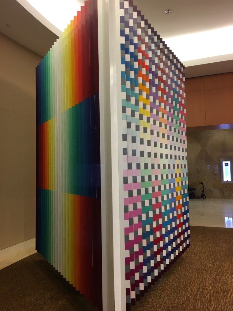 Welcome, a kinetic sculpture by Yaacov Agam, rotates constantly in the Mayo Building