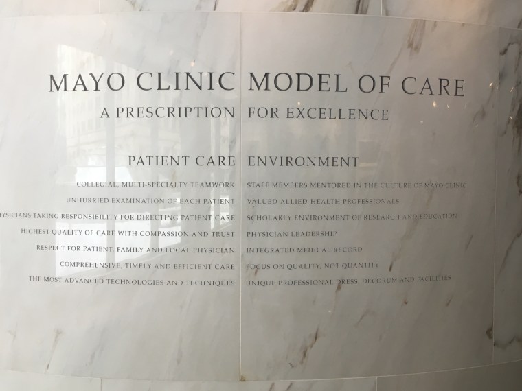 Below you can see the tenets of care that were first established by the Mayo Brothers. And as anyone who has ever been treated at Mayo can attest, they really adhere to these principles! Every time I visit, I continue to be amazed at the quality of care I receive at the Mayo Clinic.